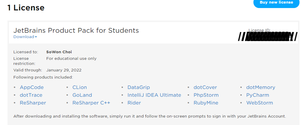 라이센스를 받으면 다음과 같은 창이 뜨고 IntelliJ 의 Ultimate로 들어가서 바로 다운 받을 수 있다!!!!!!!!!^0^