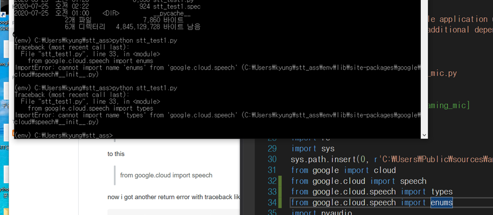 왜 google를 설치했는데도 두개는 오류가 뜨는지는 정확하게 알 수 는 없지만 pyaudio와 같이 버전차이로 인한 문제라고 생각된다. 그래서 약간... 편법으로 python37(32bit짜리) 폴더 안에 있는 내용들고 현재 내가 진행하고 있는 프로젝트 안에 있는 폴던 안을 비교 해본 결과
