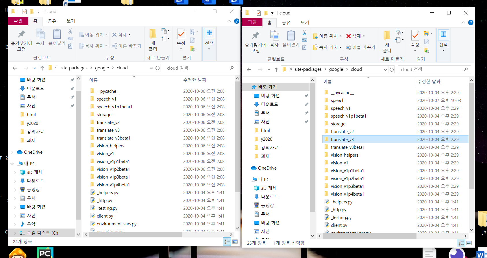 google를 설치했으면 폴더 안 lib\site-packages\google\cloud로 들어가 보면 다음과 같은 화면이 나올 것이다. 여기서 오른쪽 폴던 속에 있는 speech를 먼저 그냥 지워준다. 그 후 왼쪽 오른쪽 모두 speech_v1으로 들어간후에 왼쪽 폴더에 있는 __init__.py를 오른쪽로 옮겨준다.
