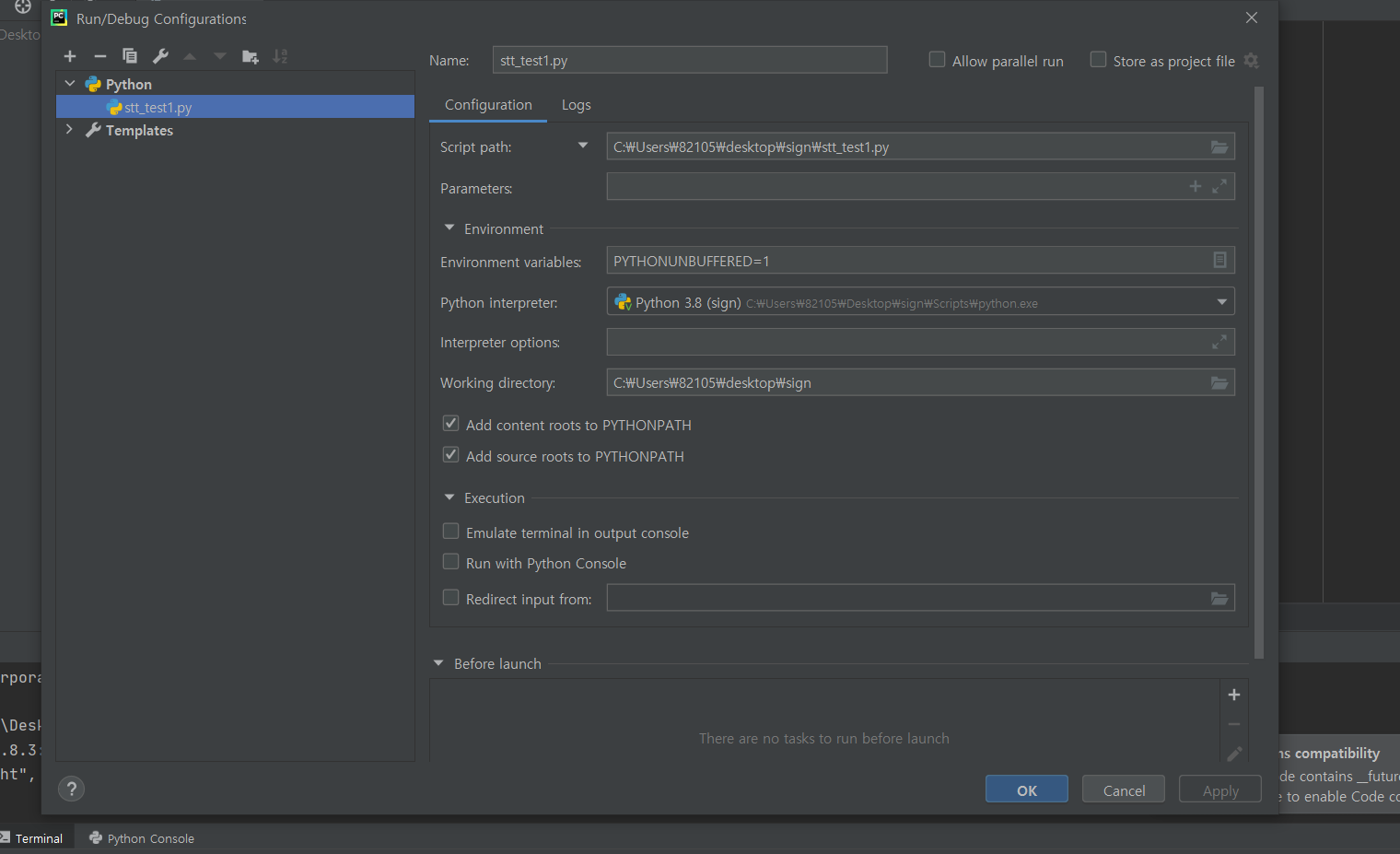 내가 돌려보고 싶은 .py들은 항상 python interpreter에서 내가 base interpreter에서 설정해준 python 3.8로 돌려야 한다. 뒤에 (sign)은 가상환경 이름(가상환경은 처음 프로젝트 생성할 때 만들어진다.)